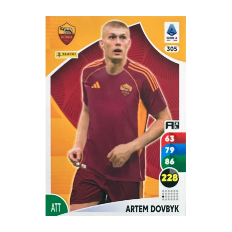 Trading Card de Artem Dovbyk del equipo Roma de la serie básica con el número 305 de la colección oficial Panini Adrenalyn XL Calciatori 2025-26.
