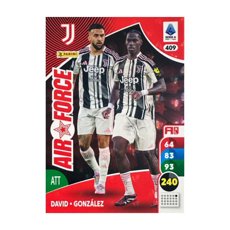 Trading Card de David-González del equipo Juventus de la serie Air Force con el número 409 de la colección oficial Panini Adrenalyn XL Calciatori 2025-26.
