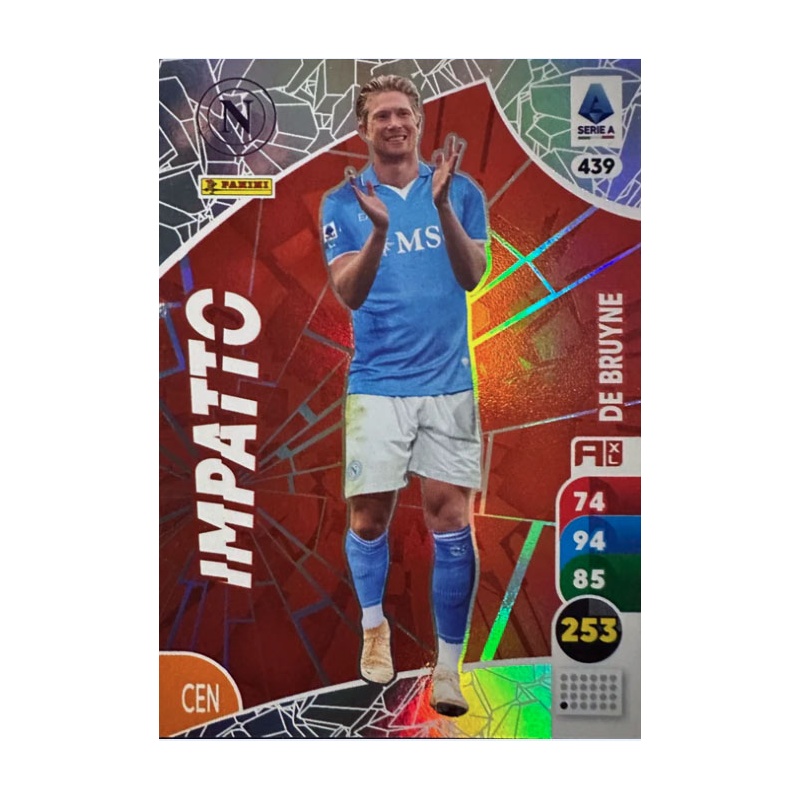 Trading Card de De Bruyne del equipo Nápoles de la serie Impatto con el número 439 de la colección oficial Panini Adrenalyn XL Calciatori 2025-26.
