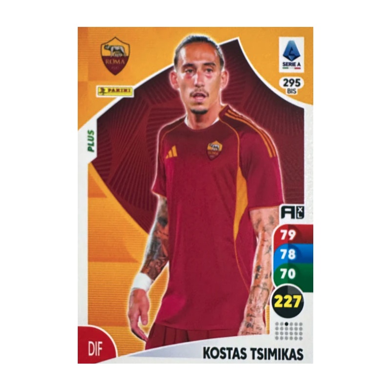 Trading Card de Kostas Tsimikas del equipo Roma de la serie Plus de la colección oficial Panini Adrenalyn XL Calciatori 2025-26.