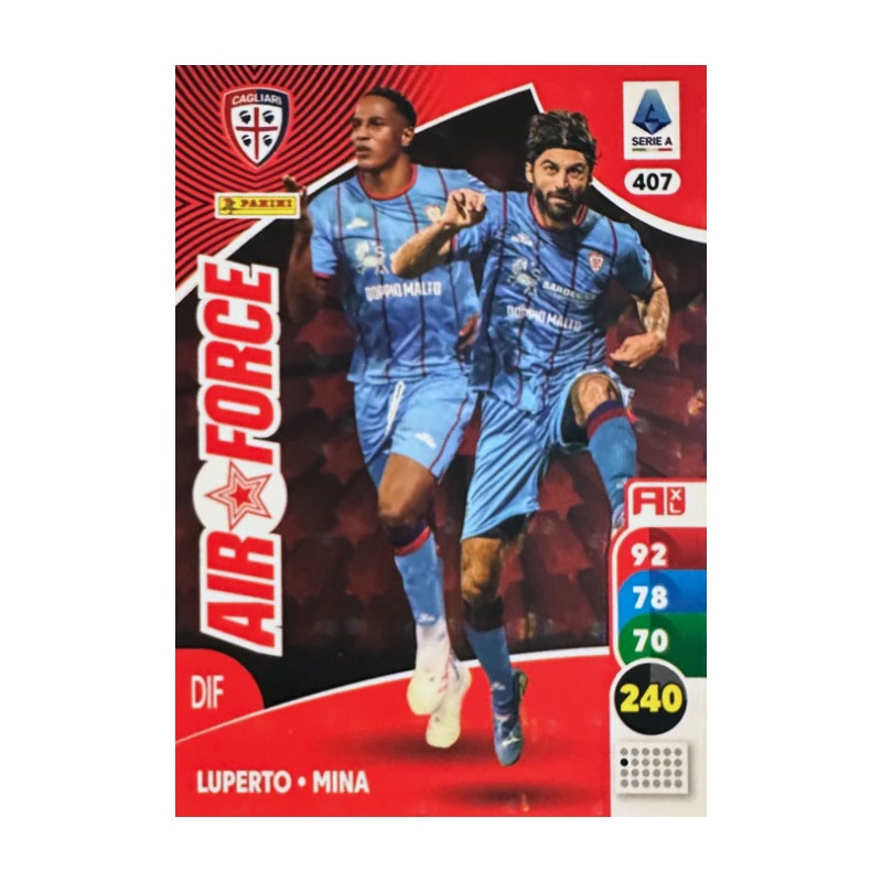 Trading Card de Luperto-Mina del equipo Cagliari de la serie Air Force con el número 407 de la colección oficial Panini Adrenalyn XL Calciatori 2025-26.