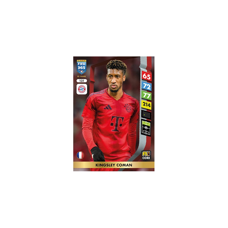 Trading Card de Kingsley Coman del equipo del Bayern München con el número 131 de la serie básica de la colección oficial Panini Adrenalyn XL Fifa 365 2025.