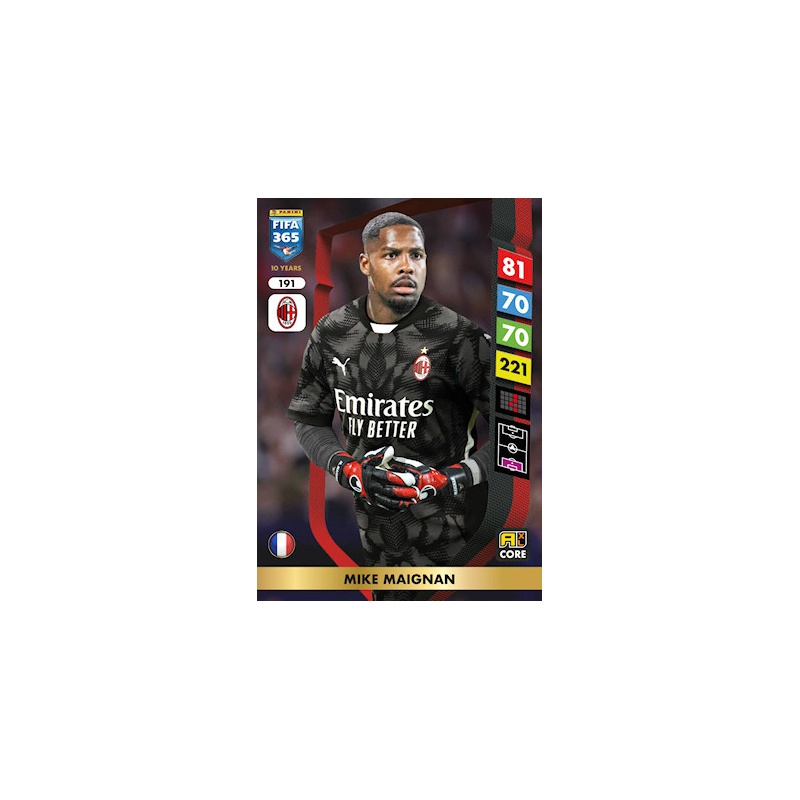 Trading Card de Mike Maignan del equipo del AC Milan con el número 191 de la serie básica de la colección oficial Panini Adrenalyn XL Fifa 365 2025.