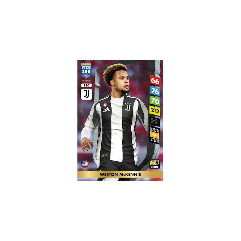 Trading Card de Weston McKennie del equipo del Juventus con el número 180 de la serie básica de la colección oficial Panini Adrenalyn XL Fifa 365 2025.