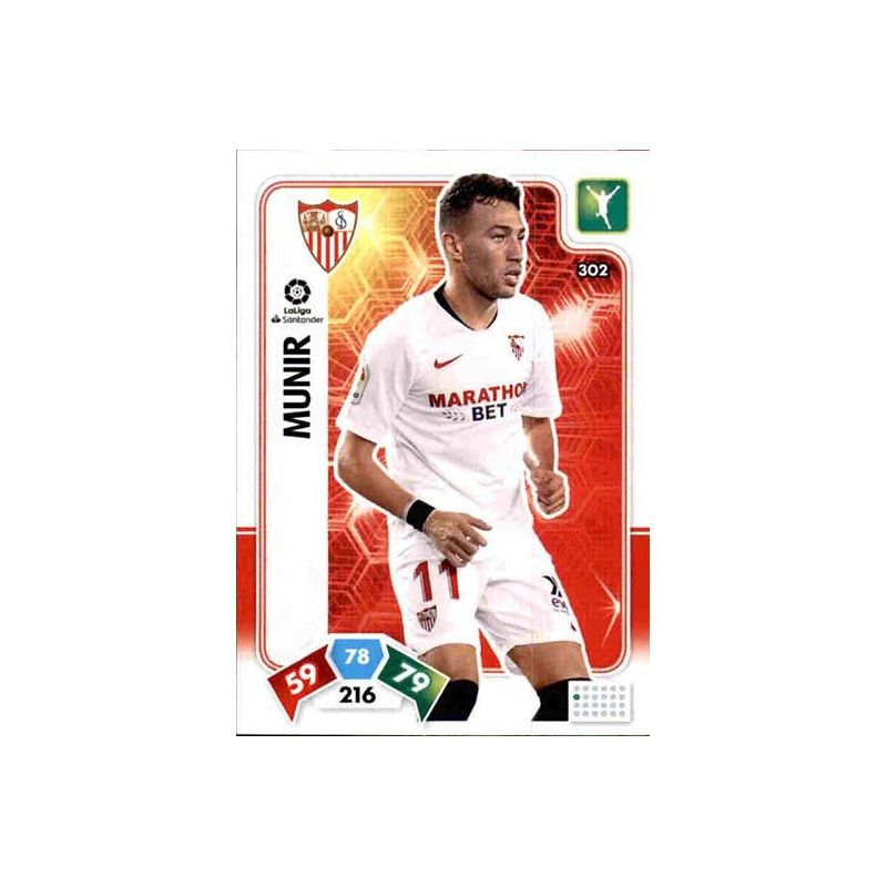 Trading Card número 302 de Munir del equipo del Sevilla que corresponde a la colección oficial Panini Adrenalyn XL Liga Santander 2019-20.