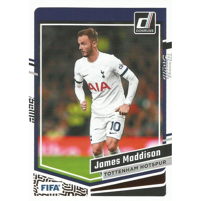 Trading Card de James Maddison del equipo de Tottenham Hotspur con el número 104 de la serie básica de la colección oficial Donruss Soccer 2023-24 de Panini.