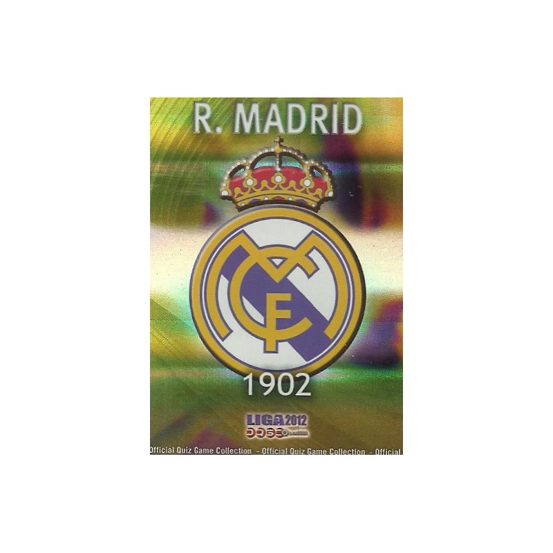 Trading Card de Escudo del equipo del Real Madrid de la serie Escudos Rayas Horizontales con el número 28 de la colección Official Quiz Game Collection Las Fichas de la Liga 2012 de Mundicromo.