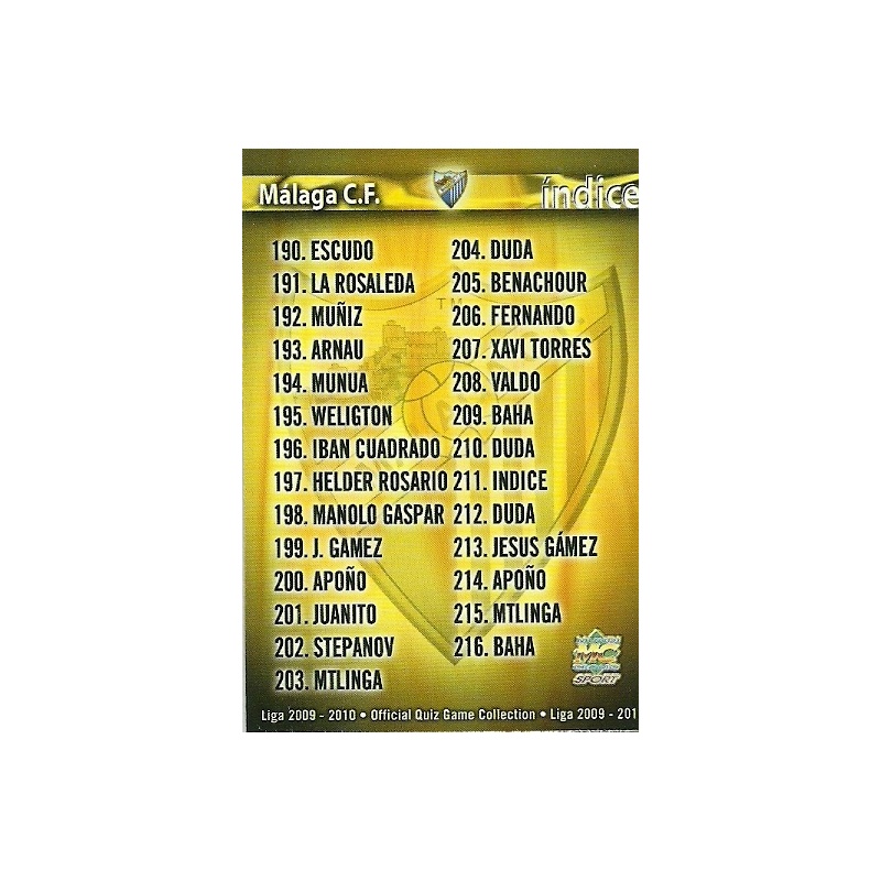 Trading Card de Indice Error del equipo del Málaga de la serie Básica con el número 211 de la colección Las Fichas de la Liga 2009-2010 Official Quiz Game Collection de Mundicromo. Error : En índice 210 Duda