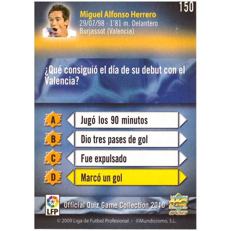 Trading Card de Michel Error del equipo del Valencia de la serie Básica con el número 150 de la colección Las Fichas de la Liga 2009-2010 Official Quiz Game Collection de Mundicromo. Error: Fecha de nacimiento 29/07/98