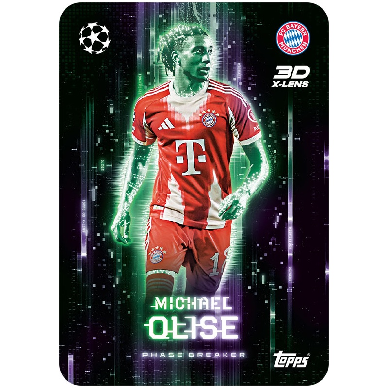 Trading Card de Michael Olise del equipo Bayern Munich de la serie 3D X-Lens Phase Shifter con el número PS-MO de la colección oficial Topps Match Attax Extra 2025-26.