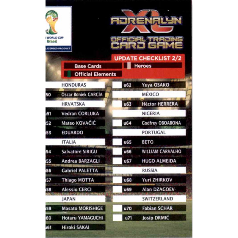 Trading Card Check List 2/2 Update Collection Panini Adrenalyn XL World Cup Brazil 2014 corresponding to the Update 2. P>