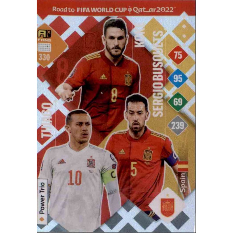 Trading Card of Koke / Sergio Busquets / Thiago from Spain national team with number 330 from Power Trio series from Panini Adrenalyn XL Road To Fifa World Cup Qatar 2022 Collection.