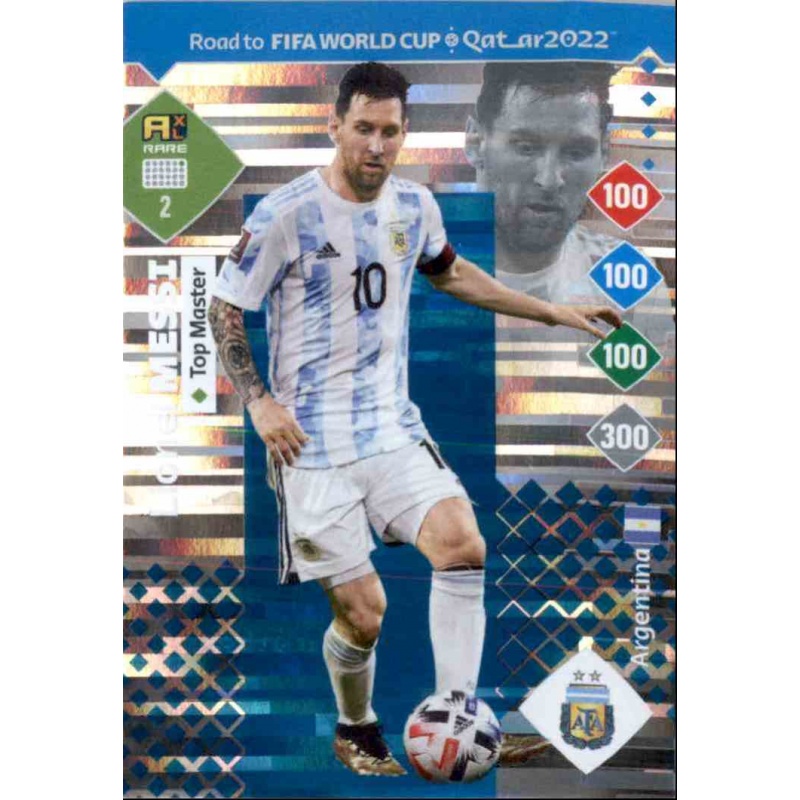 Trading Card of Lionel Messi from Argentina national team with number 2 from Top Master series from Panini Adrenalyn XL Road To Fifa World Cup Qatar 2022 Collection.