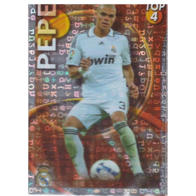 Trading Card of Pepe from Real Madrid team from Top Rojo Letras series with number 560 from the Mundicromo Las Fichas de la Liga 2010 Official Quiz Game Collection.