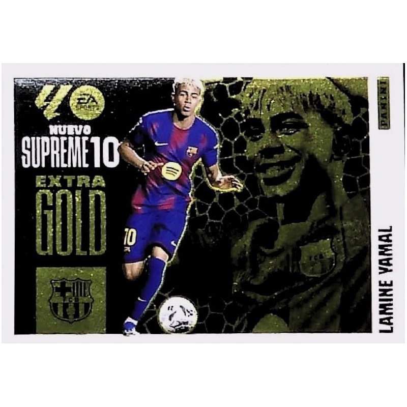 Sticker of Lamine Yamal from Barcelona team from the Nuevo Supreme 10 Extra Gol series with number from official collection Panini Liga Este 2025-26.