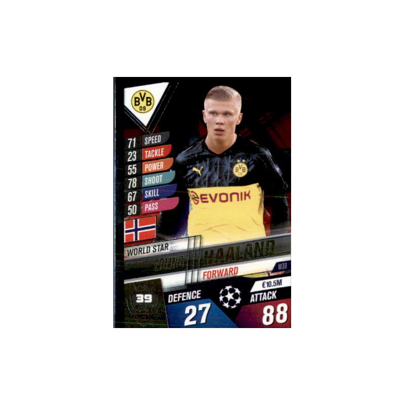 Trading Card of Erling Haaland of the team of Brussia Dortmund of the World Star series with number W39 from the Topps Match Attax 101 Season 2019-20 Collection.