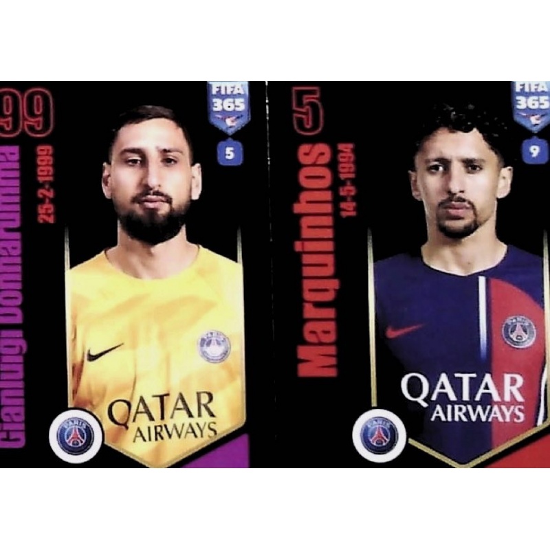Sticker of Gianluigi Donnarumma / Marquinhos from the base series from PSG team with number 214 from official collection Panini FIFA 365 Sticker Collection 2024.